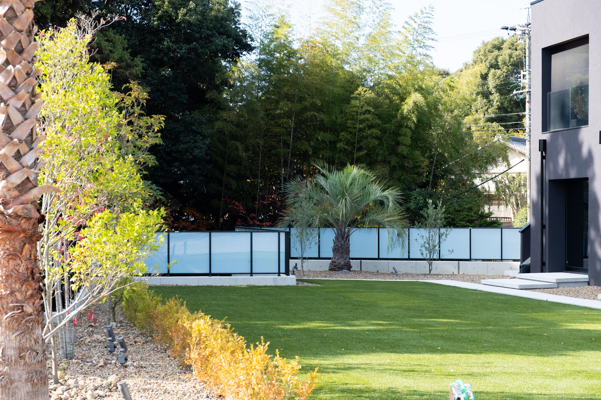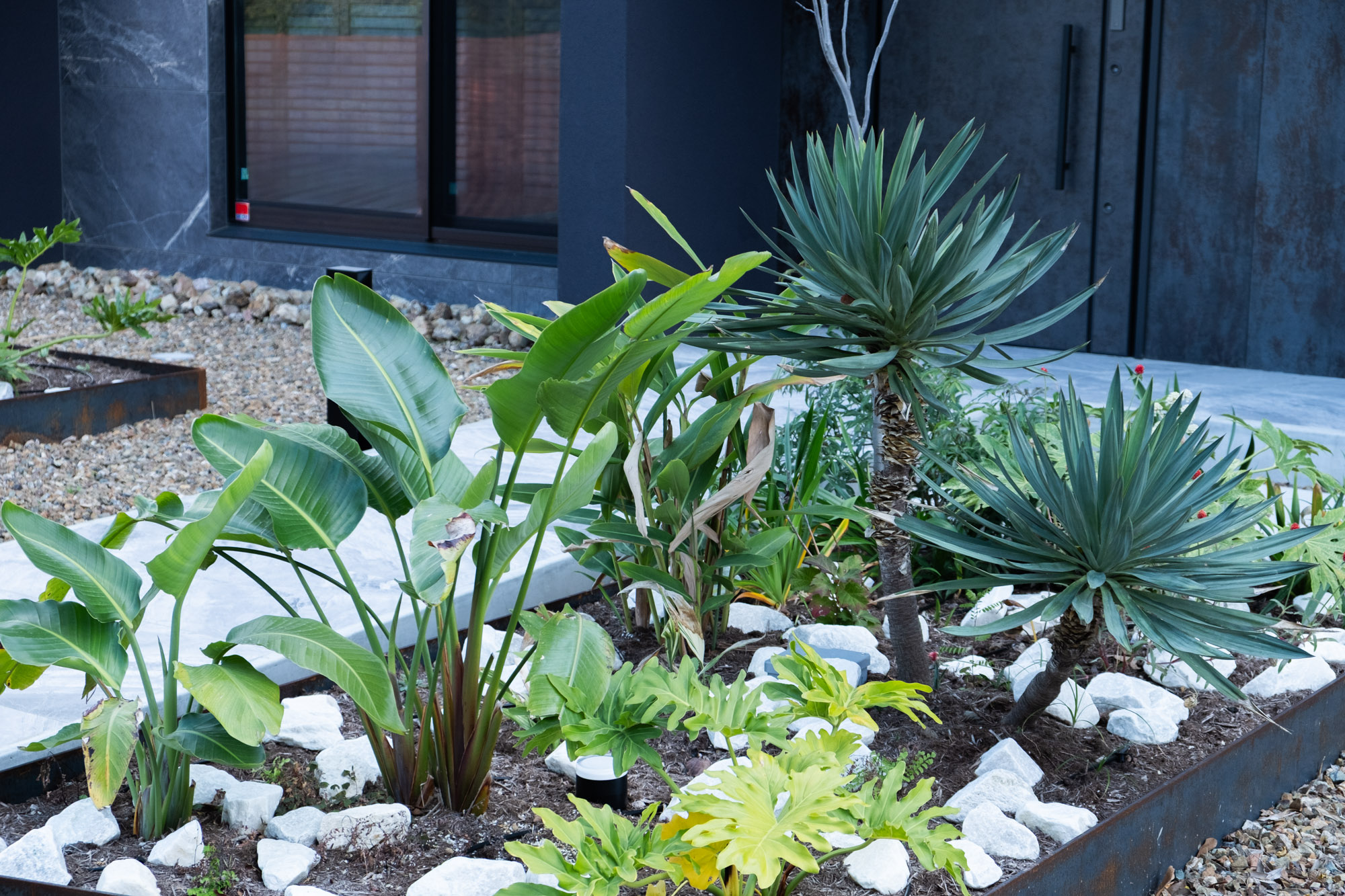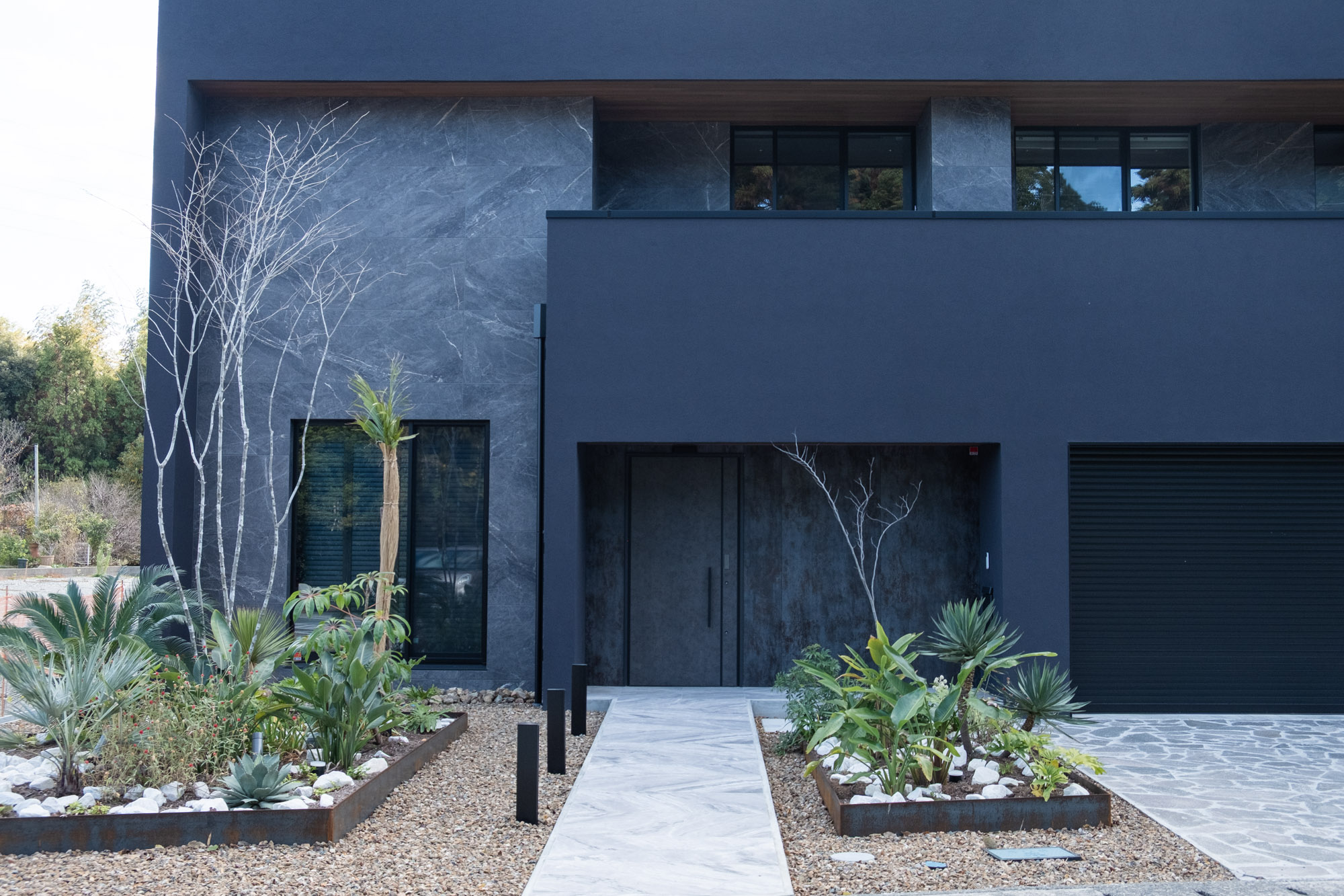 Plan Pointリゾートを意識した植栽設計です。 クライアントの要望を意識して亜熱帯植物を採用しながら周辺の環境に馴染むよう固有種を混植しました。 外壁のテクスチャとリンクする様にアプローチの植栽帯には経年変化でサビ模様になるスチールの花壇を製作しました。竣工日:2025年7月デザイン:植栽設計