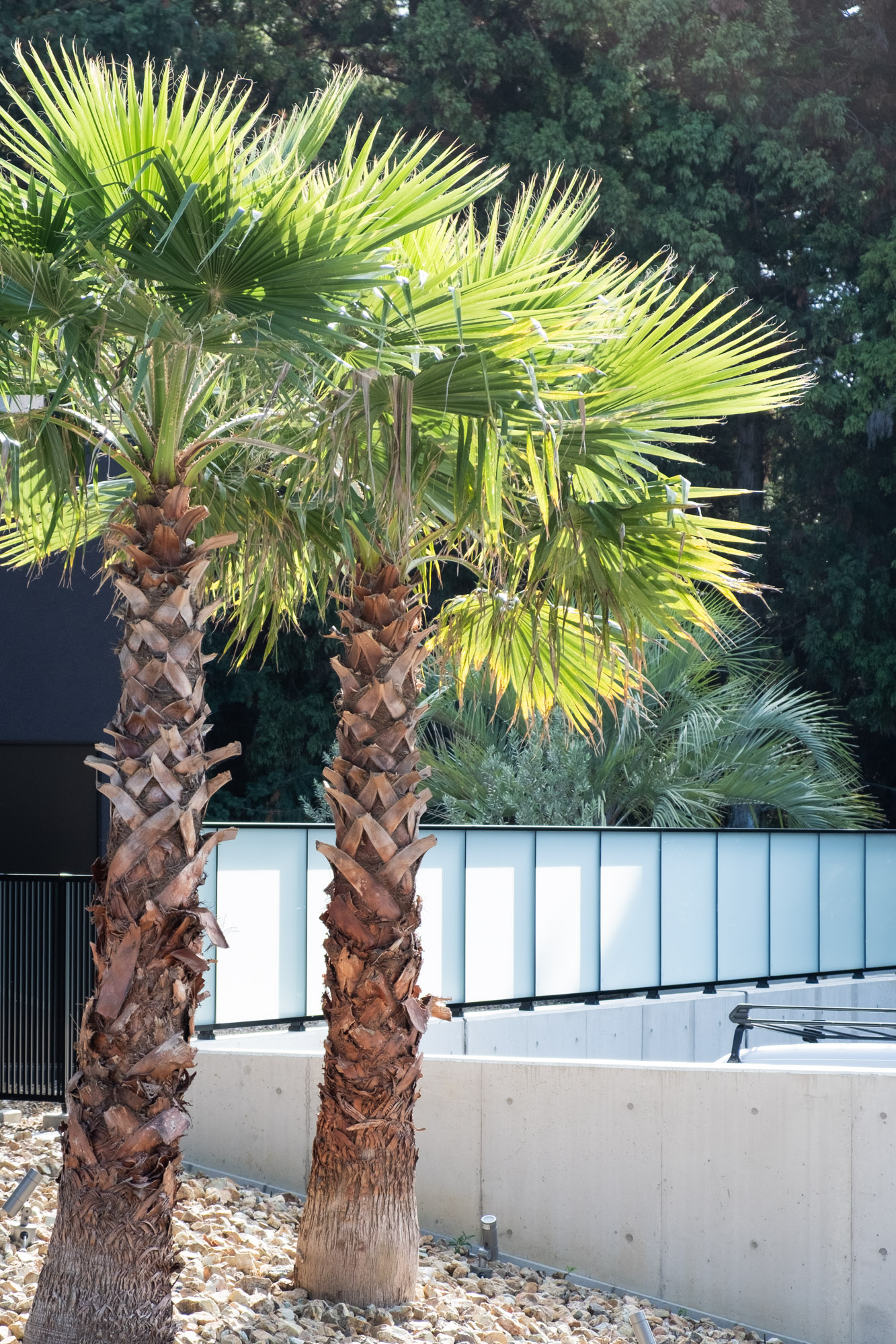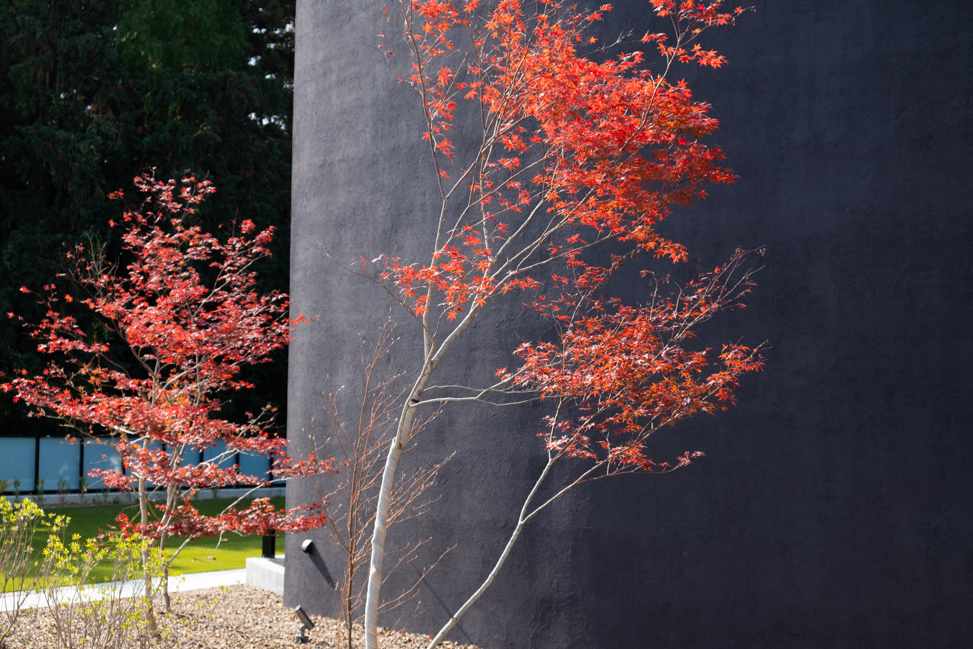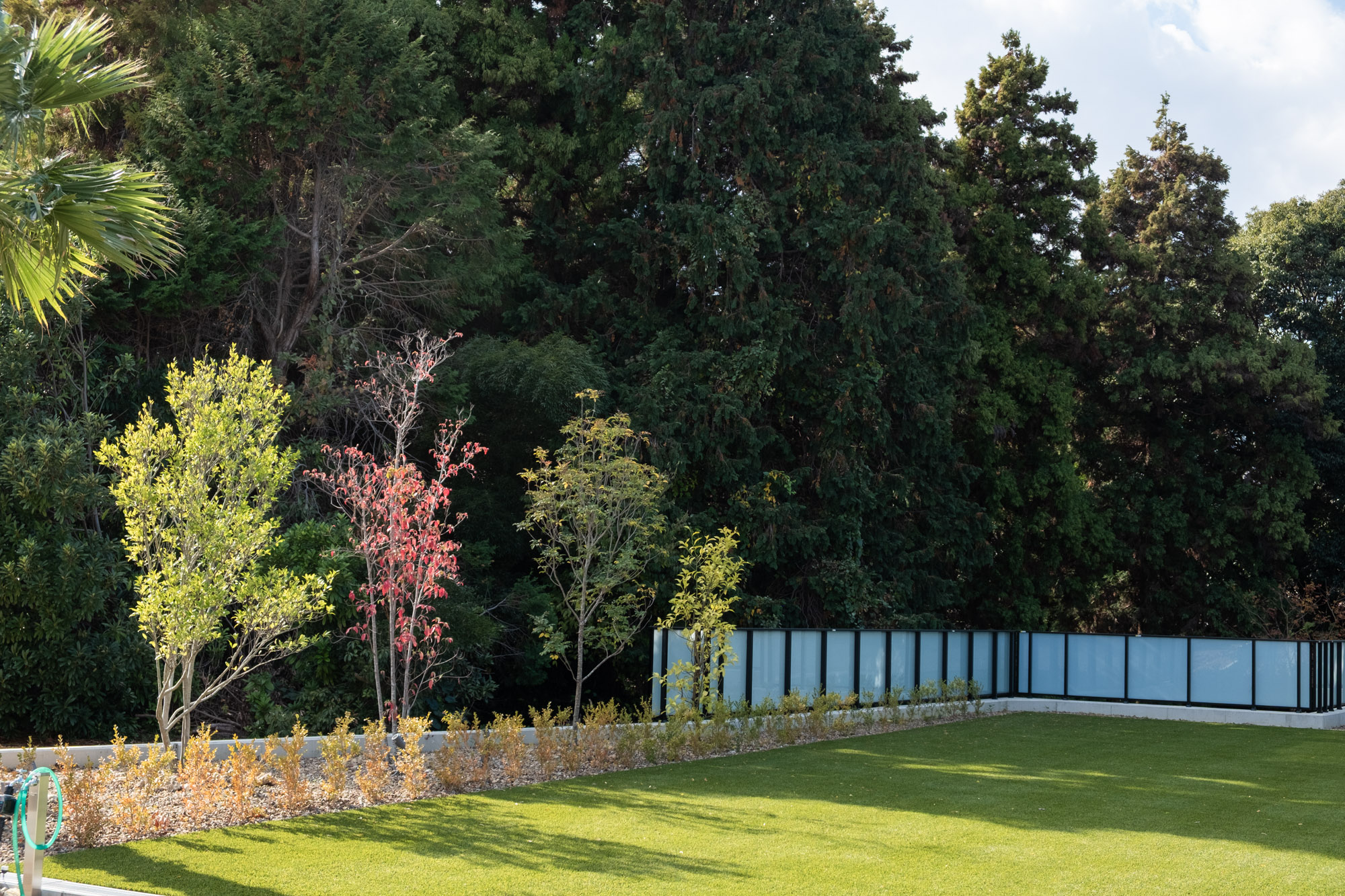 Plan Pointリゾートを意識した植栽設計です。 クライアントの要望を意識して亜熱帯植物を採用しながら周辺の環境に馴染むよう固有種を混植しました。 外壁のテクスチャとリンクする様にアプローチの植栽帯には経年変化でサビ模様になるスチールの花壇を製作しました。竣工日:2025年7月デザイン:植栽設計
