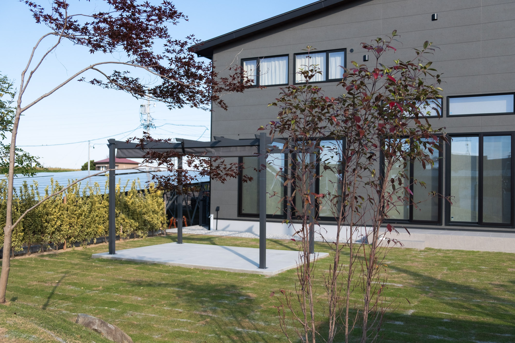 庭スペースはドックラン、パーゴラのあるテラス、南端にはお施主様の果樹や野菜を育てられる菜園スペースがあります。