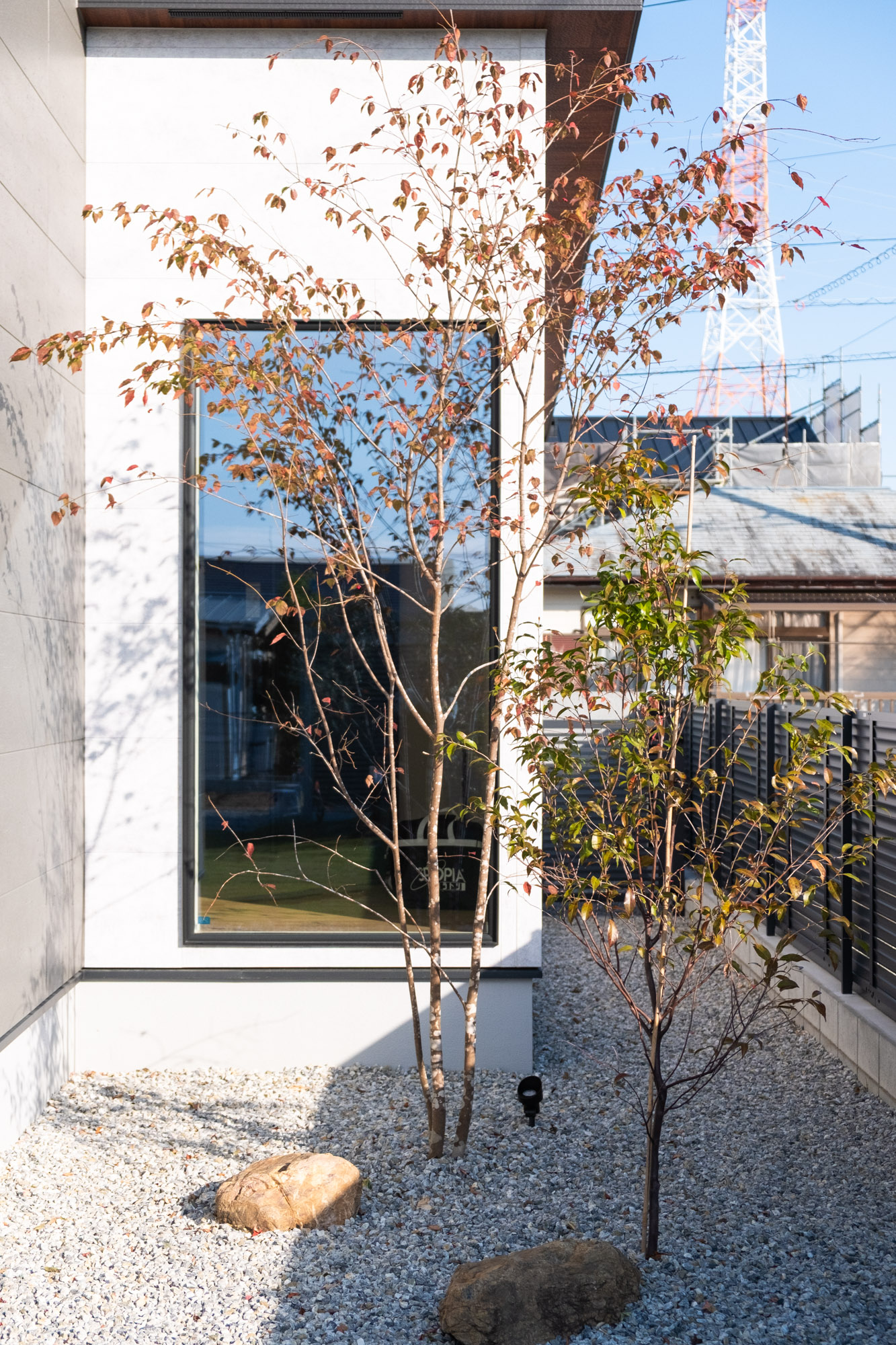 広い敷地の外構計画です。北側道路の土地なので北側を駐車場、建物南面にプラーベートな広い庭スペースを取りました。