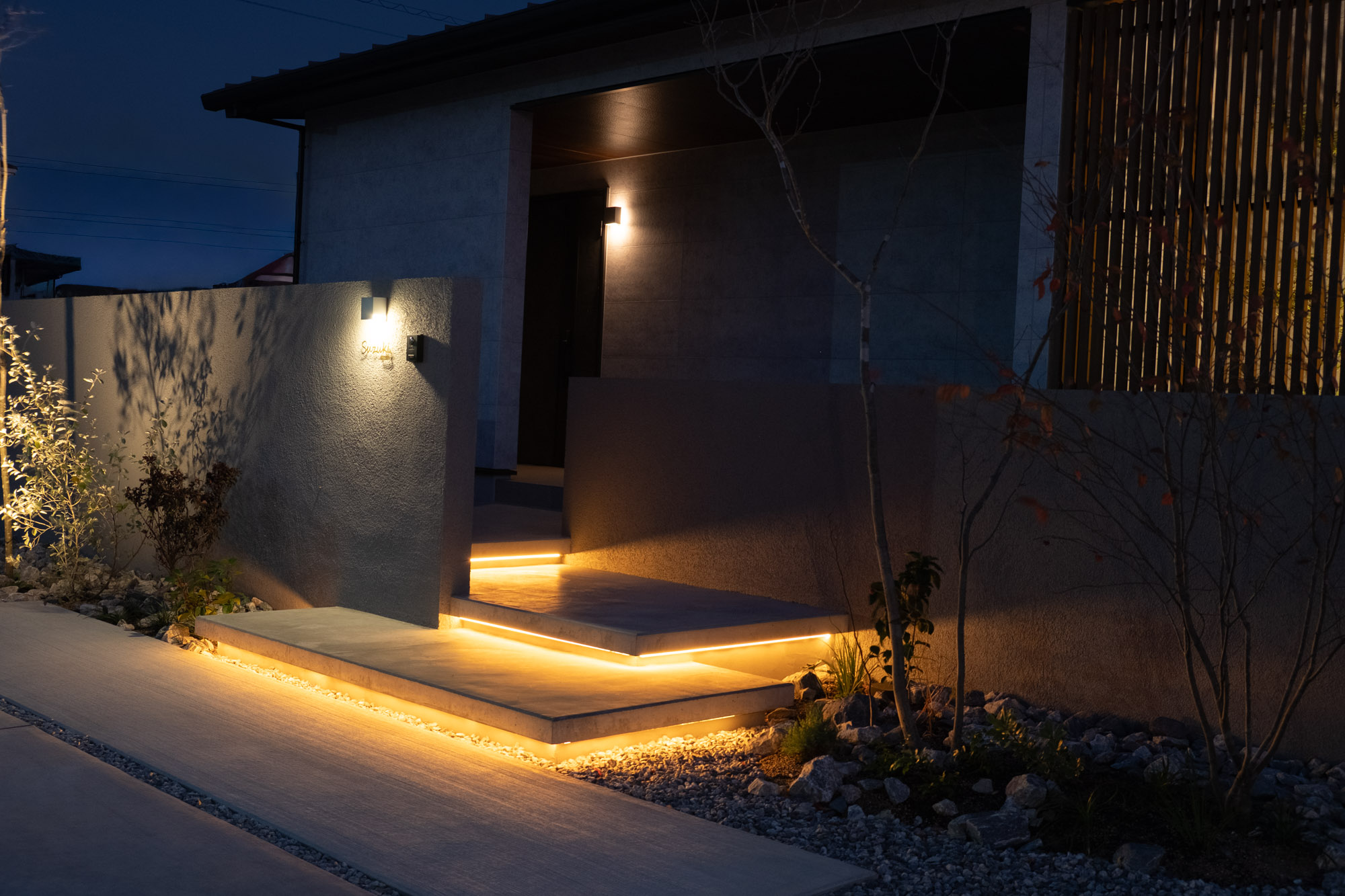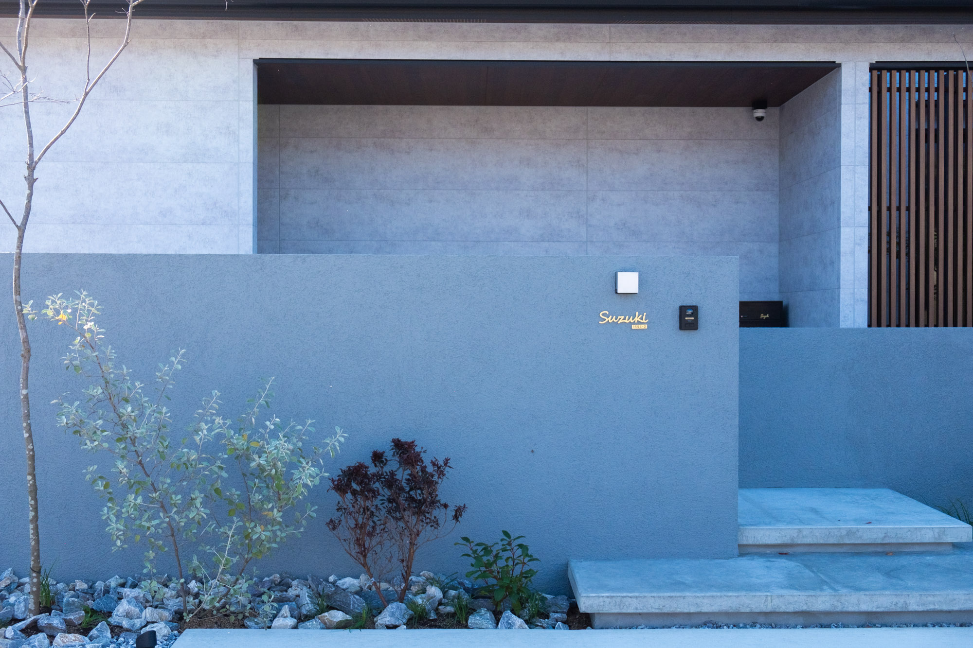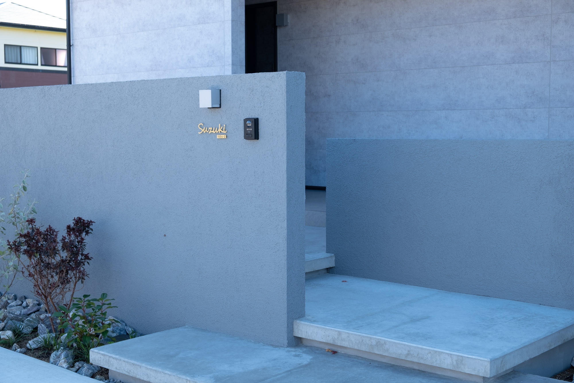 北側アプローチは高さのある塗壁門袖を設けてセミクローズドにし、シンプルなコンクリート仕上げのコンクリートステップになっています。
