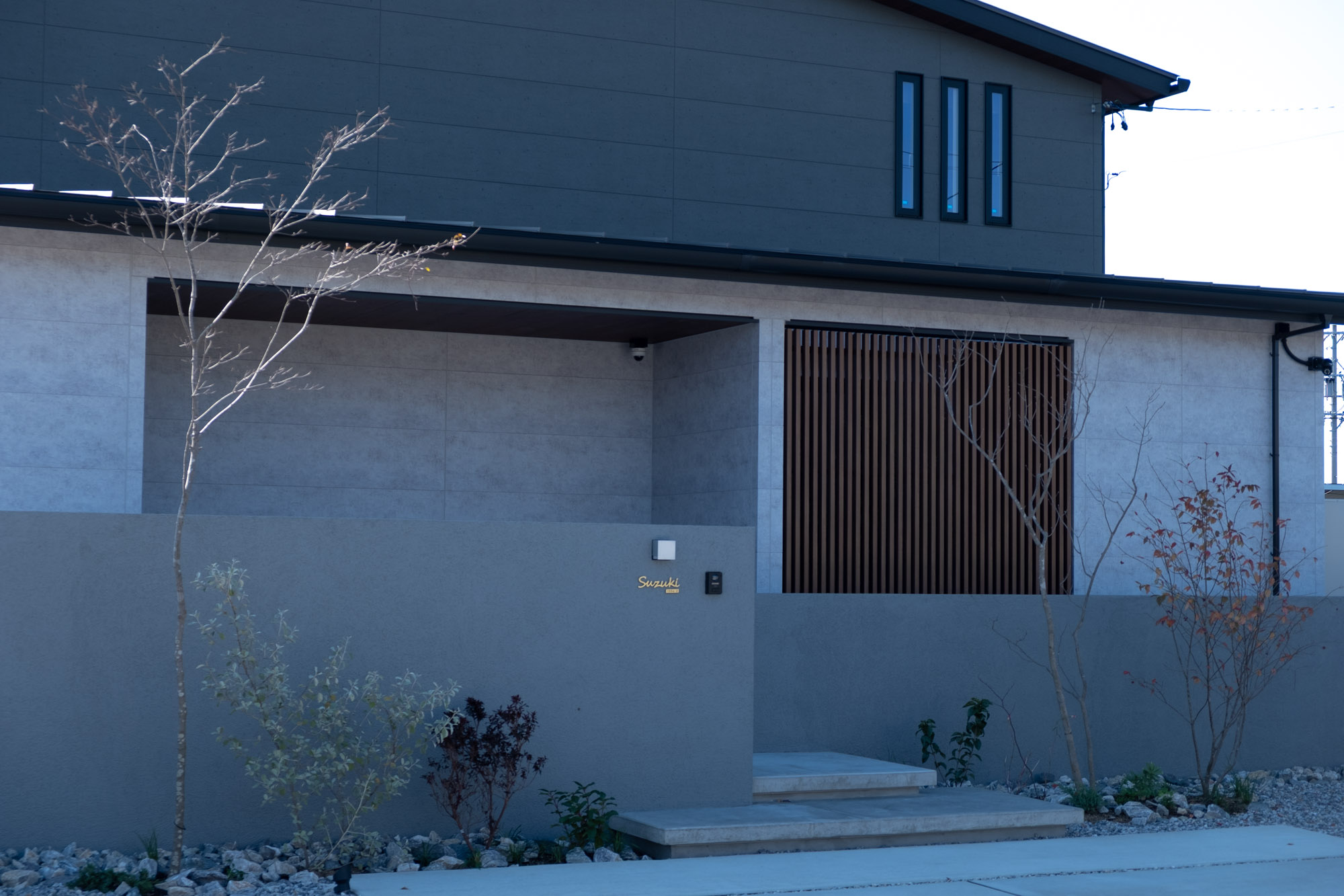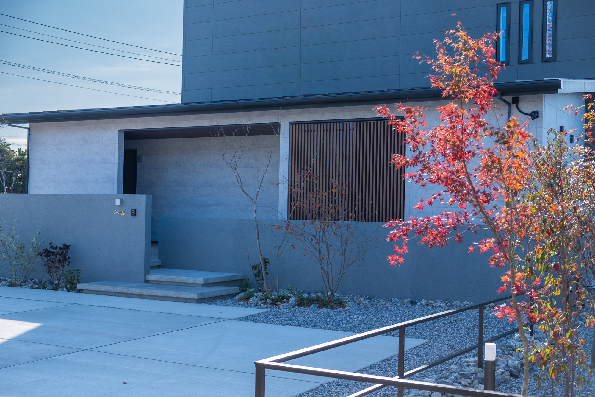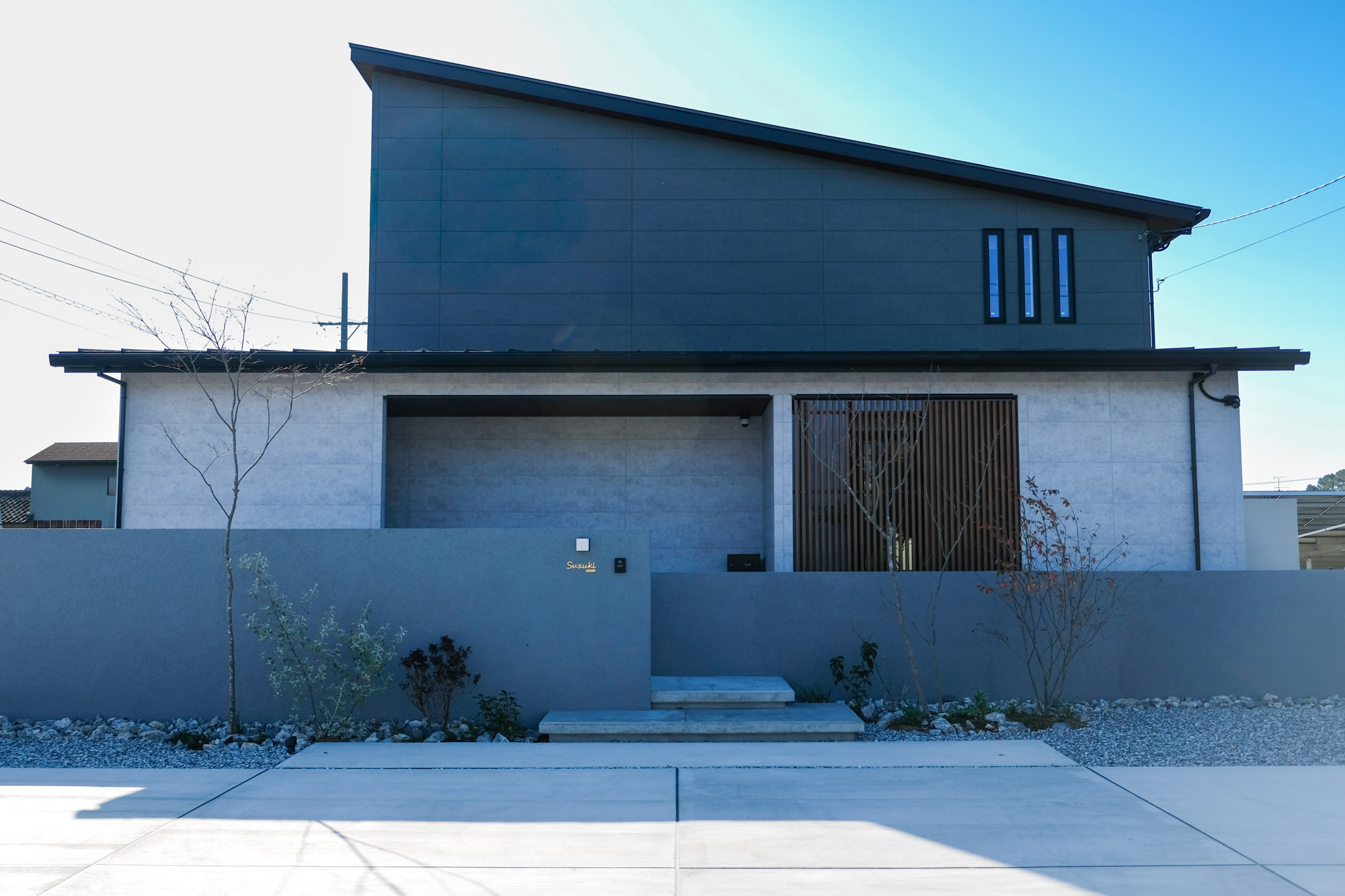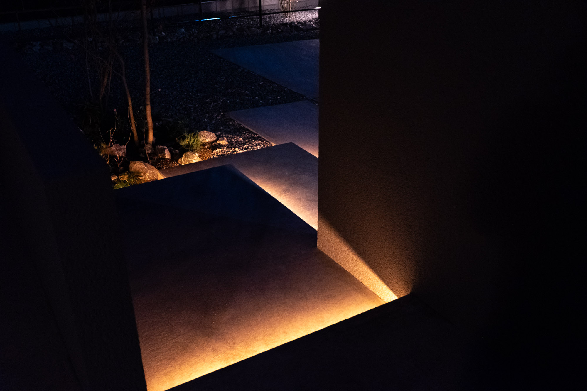 北側アプローチは高さのある塗壁門袖を設けてセミクローズドにし、シンプルなコンクリート仕上げのコンクリートステップになっています。