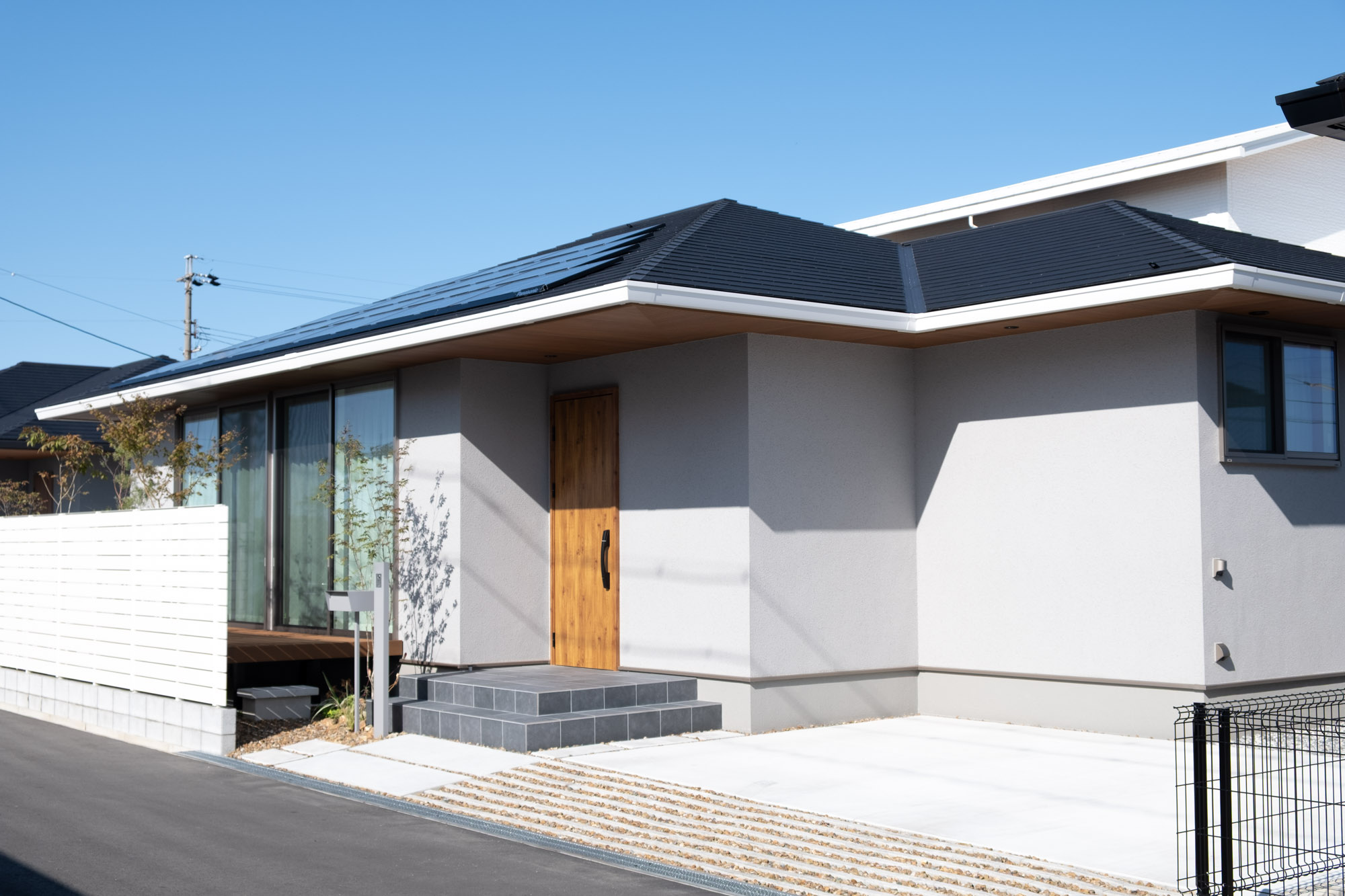 Plan Point旗竿地分譲地の一区画の外構工事です。周辺環境を考慮して建物南面をプライバシーの確保のため目隠しフェンスとしました。 フェンスは建物のイメージに合わせてホワイトの樹脂フェンスとし、広めにとったデッキとの隙間に植栽スペースを設けました。 落ち着くリビングスペースを意識して植栽配置を、軒のある平屋住宅ですが和の雰囲気に近づかないように意識してデザインしました。竣工日:2025年9月デザイン:モダン駐車スペース:3台